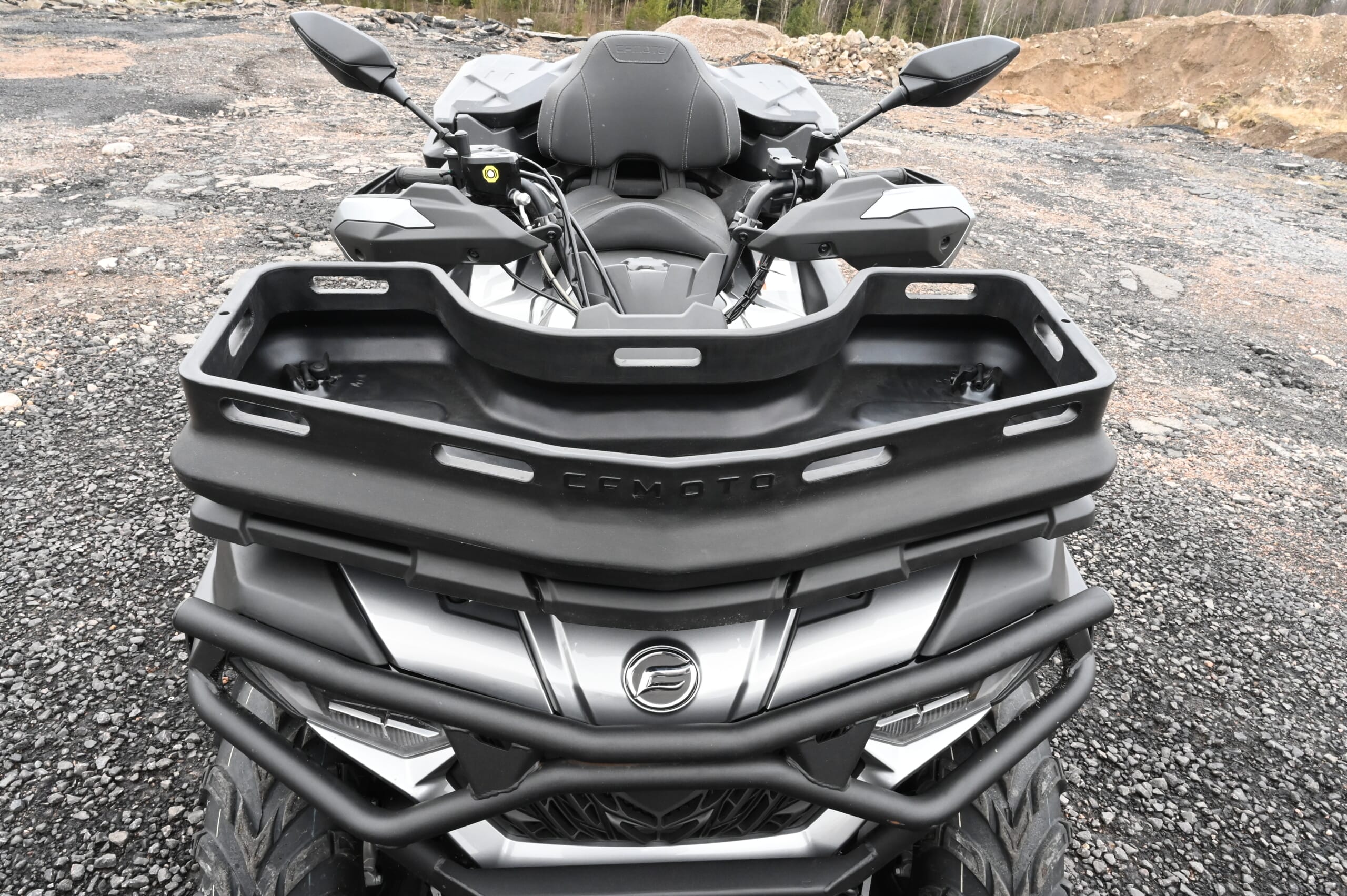 Oppbevaringskurven er laget av slagfast plast, og den har flere festepunkter for bagasjestropper og andre stropper som bidrar til å holde lasten på plass. Den fremre kurven er lett for å minimere belastningen på panseret, og den monteres enkelt med de fire medfølgende quick connect-festene fra CFMOTO.