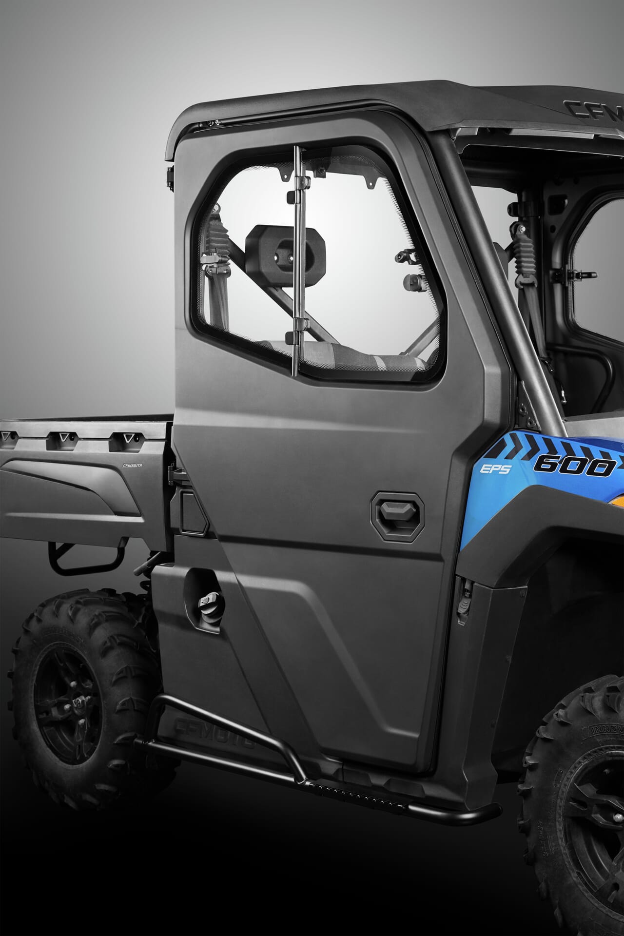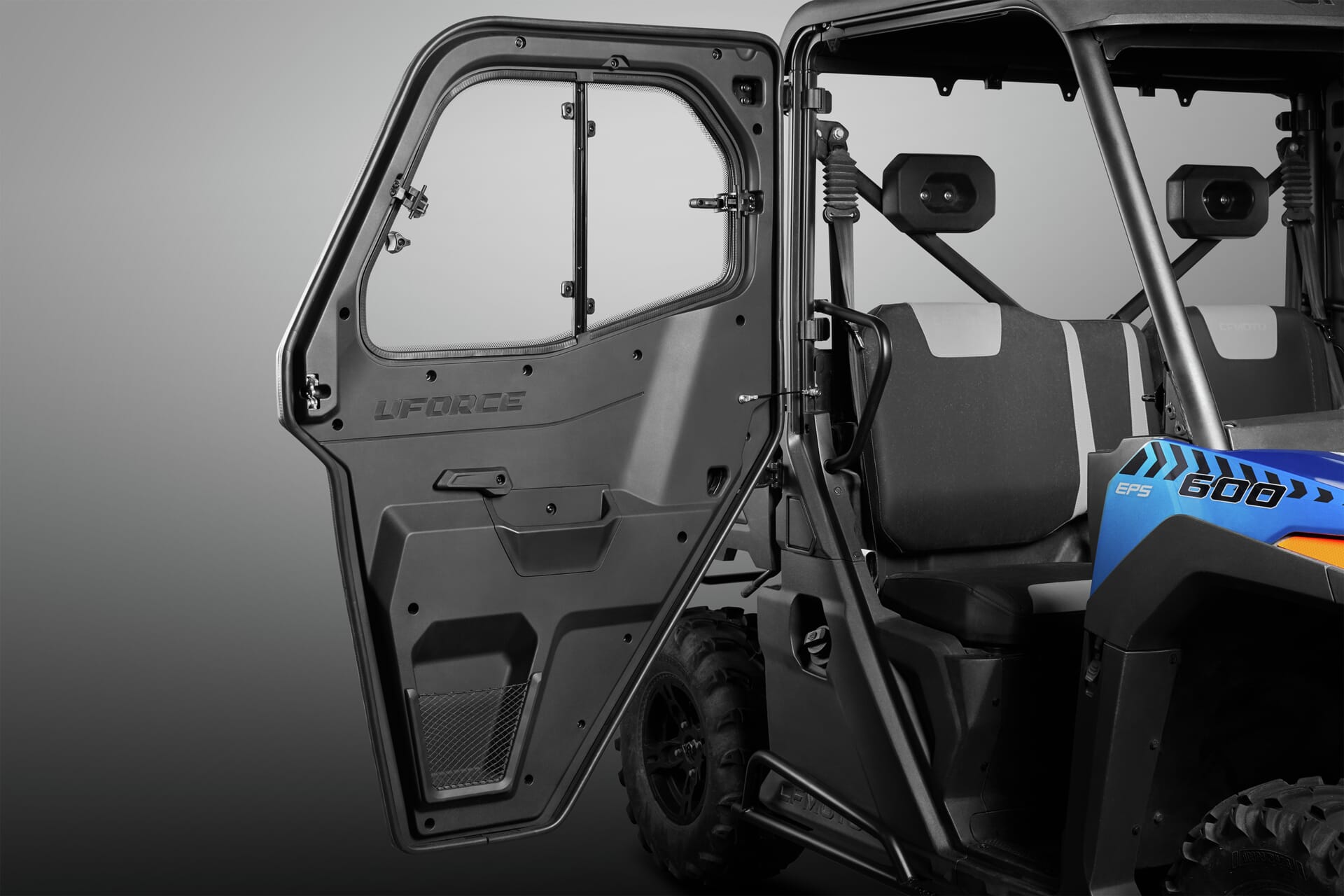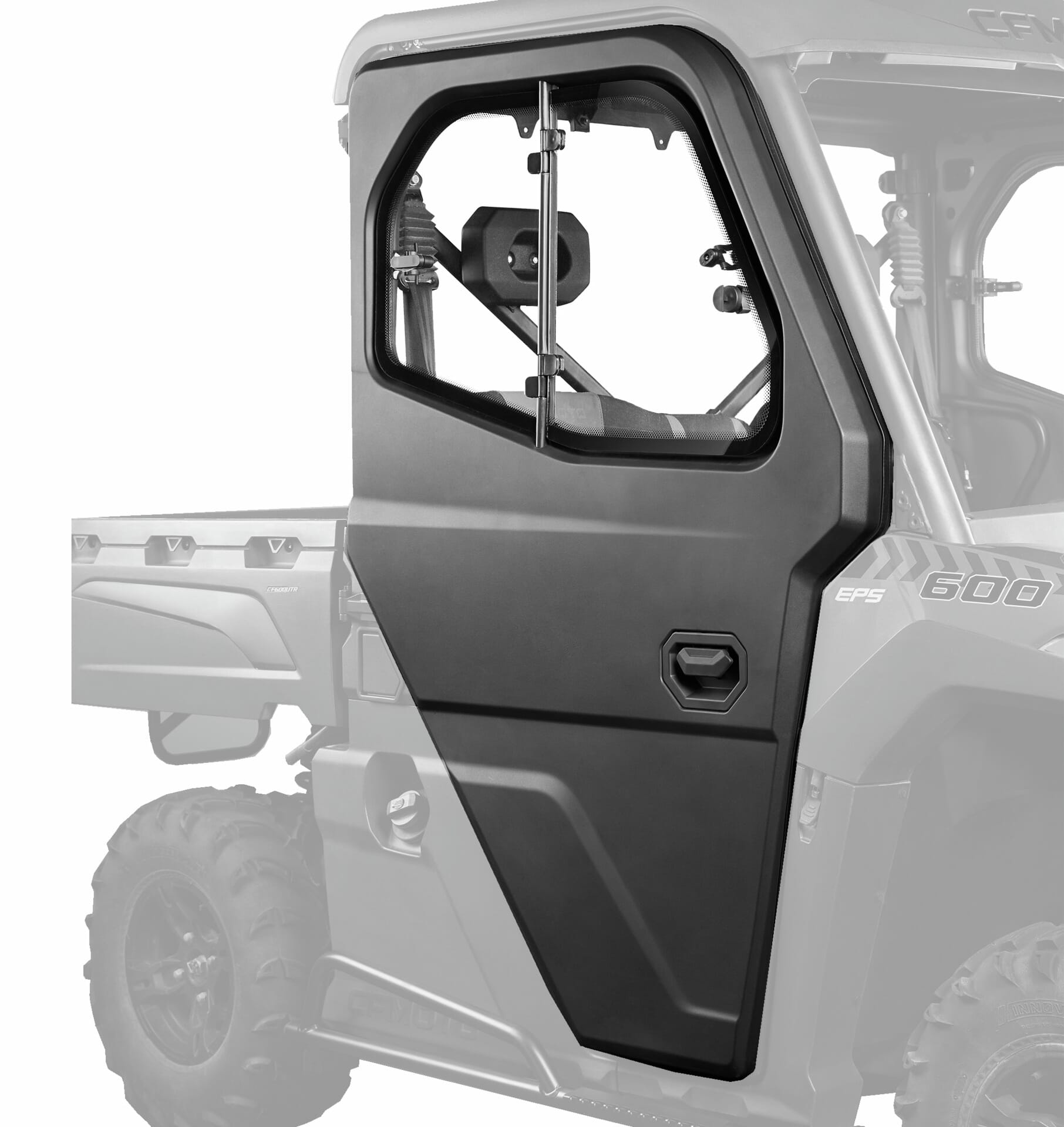 Skitt, sand, steiner og greiner er en selvfølge når man kjører i terrenget. Med enkel montering av dører beskytter du både deg selv og din passasjer for eventuelle skader og sparer deg for mye rengjøring etter en vellykket tur. Dører gjør det selvsagt vanskelig for objekter å komme inn i førerhytten men desto viktigere at ingenting faller ut. Dørene gir et løft i utseende til din UFORCE 600 uten å påvirke sikten for mye.