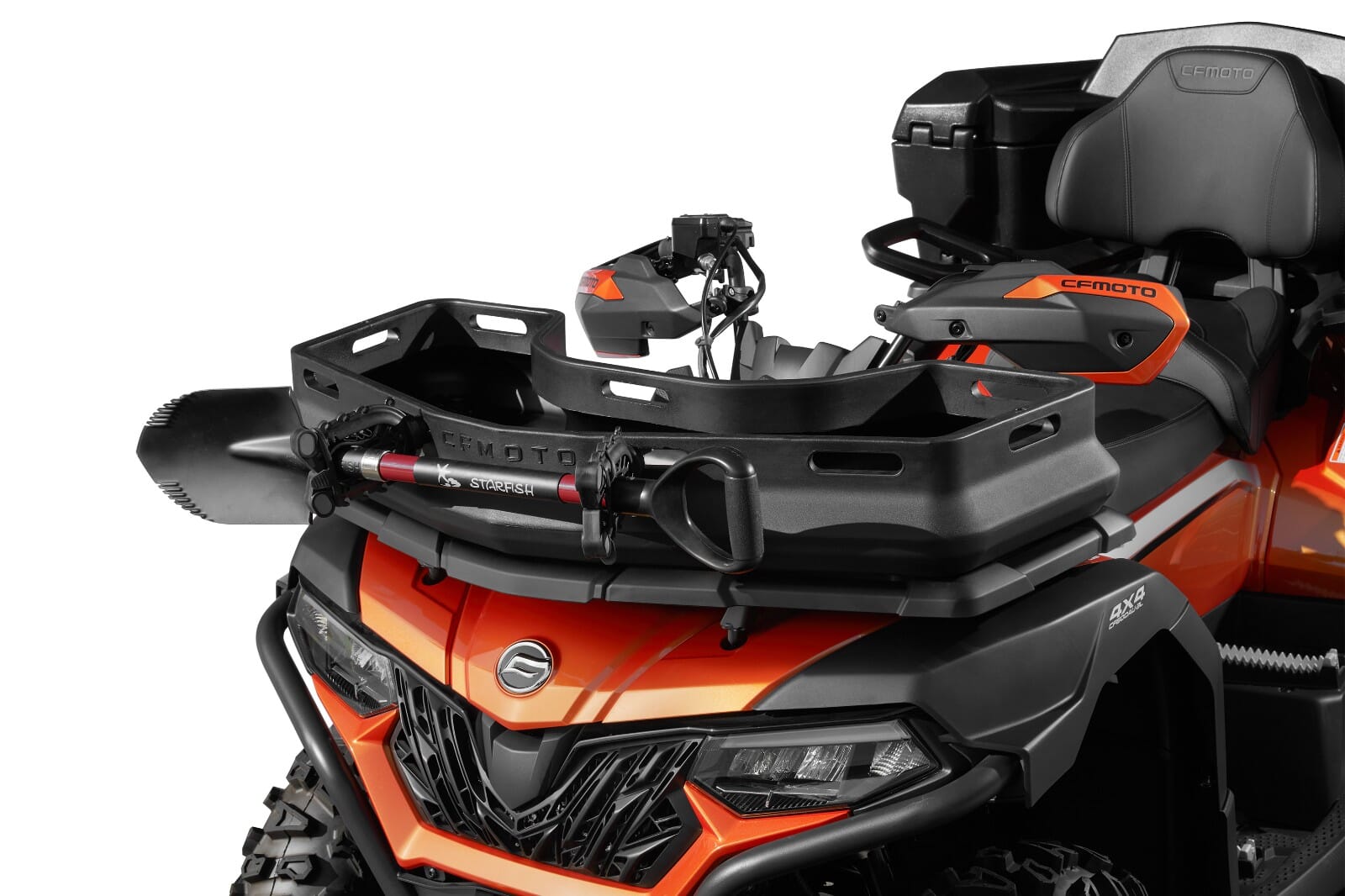 Den fleksible redskapsholderen monteres enkelt uten verktøy, siden den installeres med justerbare quick connect-klemmer som er tilpasset alle CFMOTO-modeller med plaststativ.
