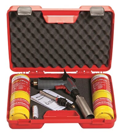 Vulcane brennerkoffert med Express 472 brenner. Koffert leveres komplett med 2 stk. MAPP flasker, syklon brenner, varmlufts brenner og ekstra piezo tenner. Varmlufts brenner må kun brukes med MAPP gass.