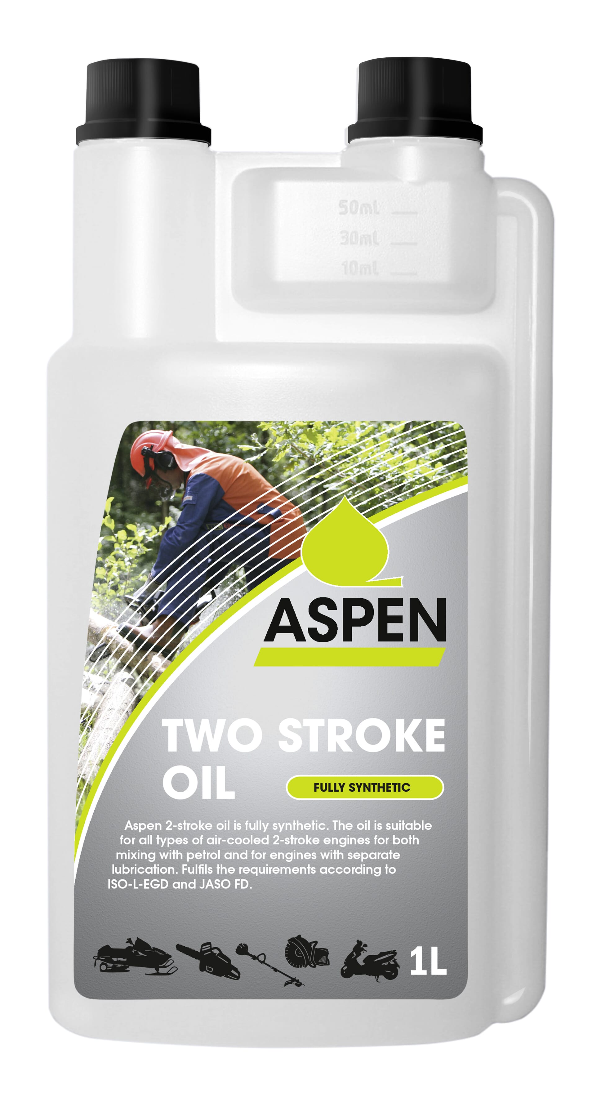 Aspen 2-taktsolje er en helsyntetisk motorolje for alle typer luftkjølte 2-taktsmotorer, både ved forblanding av bensin der det kreves mer enn 2% olje og for separatsmurte motorer. Spesielt fremstilt for hard belastning av 2-taktsmotorer innen skogbruk, hage og andre småmaskiner som ofte startes kalde. Gir lav røykutvikling og har lavt askeinnhold.
