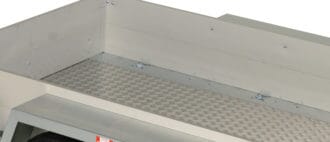 Stålskinner med nedfelte, kraftige surreringer. Surreringer oppå finerplate eller i sidekarmer er i veien ved lasting og lossing, eller når en spar sand. Våre surrefester er naglet til en stålplate, noe som gir en mye bedre forankring enn når de festes i finèr. Hvert surrefeste er godkjent for 800kg. Husk å bruke CE-merket lastestropper, for din egen og alle dine medtrafikanters sikkerhet.